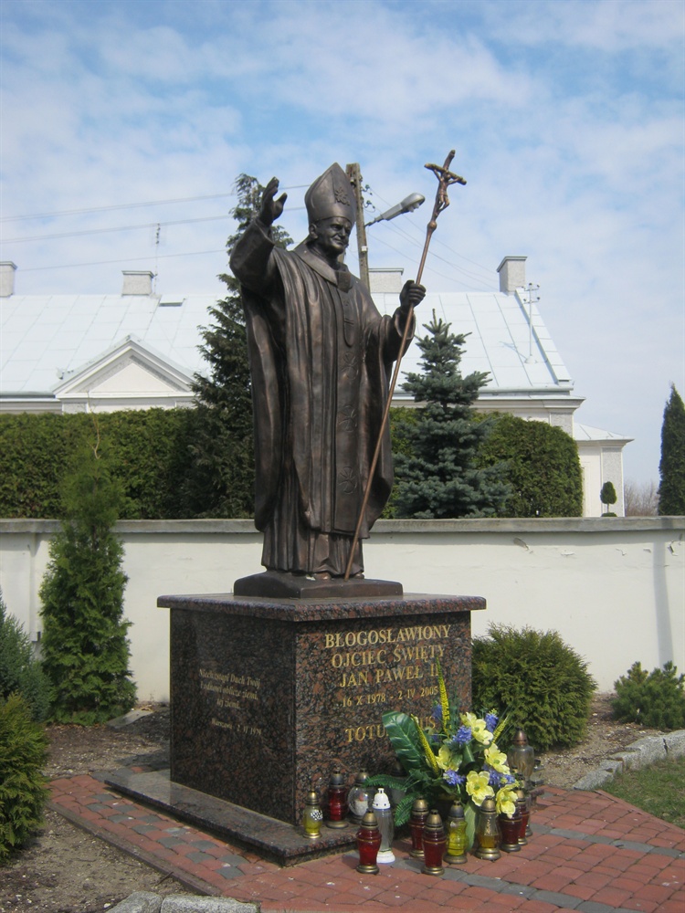 Pomnik Jana Pawła II znajduje się przy murze po lewej stronie w pobliżu kościoła św. św. Apostołów Piotra i Andrzeja. Przedstawia on postać Jana Pawła II ustawionego na czworokątnym postumencie, na którym, na ścianach, są wyryte słowa wypowiedziane podczas pielgrzymek do Ojczyzny. Na jednej z nich znajdują się słowa wypowiedziane podczas pielgrzymki do Krakowa w dniu 17 sierpnia 2002 roku „W Miłosierdziu Boga świat znajdzie pokój, a człowiek szczęście. Bądźcie świadkami miłosierdzia”, natomiast drugiej ścianie pamiętne słowa wypowiedziane podczas mszy świętej na placu obecnie Piłsudskiego w Warszawie w dniu 2 drugiego czerwca 1979 roku „Niech zstąpi Duch Twój i odnowi oblicze ziemi, tej ziemi”.