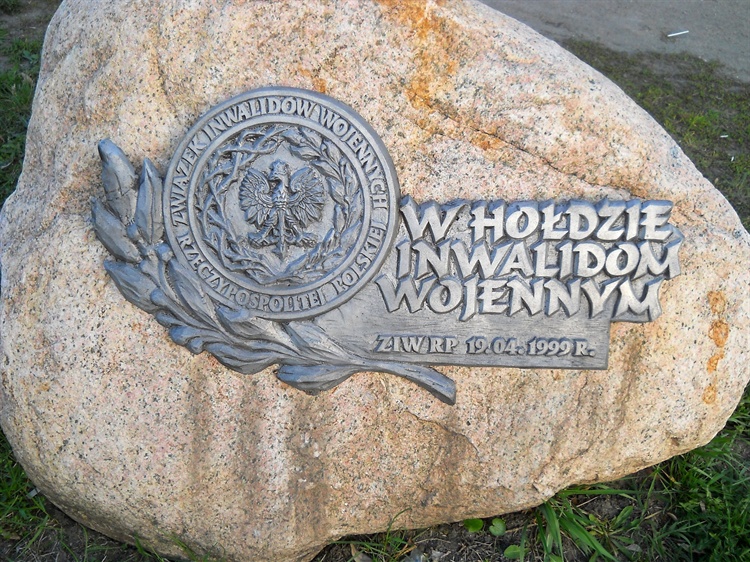 Tablica pamiątkowa "W holdzie inwalidom wojennym" znajduje się przy ul. 17 Stycznia. Została ufundowana przez Związek Inwalidów Wojennych 19 kwietnia 1999 roku. Zamontowana jest na głazie narzutowym. Z lewej strony przedstawia sylwetkę orła w koronie, a pod nim laur.