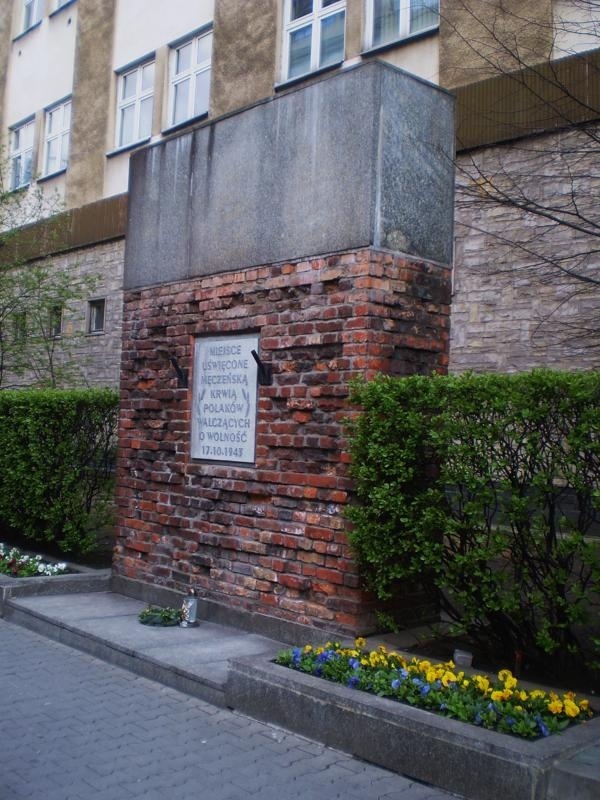 Jest to tablica z piaskowca na fragmencie muru: „Miejsce uświęcone męczeńską krwią Polaków walczących o wolność 17 X 1943”. Wmurowana została w latach 50.
