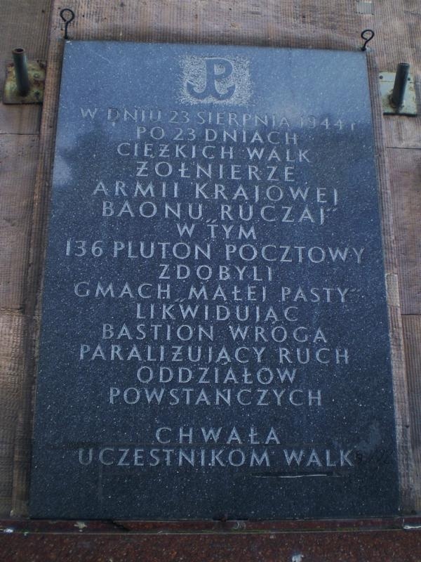 Jest to tablica z granitu na frontowej ścianie budynku: „W dniu 23 sierpnia 1944 r. po 23 dniach ciężkich walk żołnierze Armii Krajowej baonu «Ruczaj», w tym 136 pluton pocztowy zdobyli gmach «Małej Pasty», likwidując bastion wroga paraliżujący ruch oddziałów powstańczych Chwała uczestnikom walk”. Tablicę wmurowano w 1980 roku.
