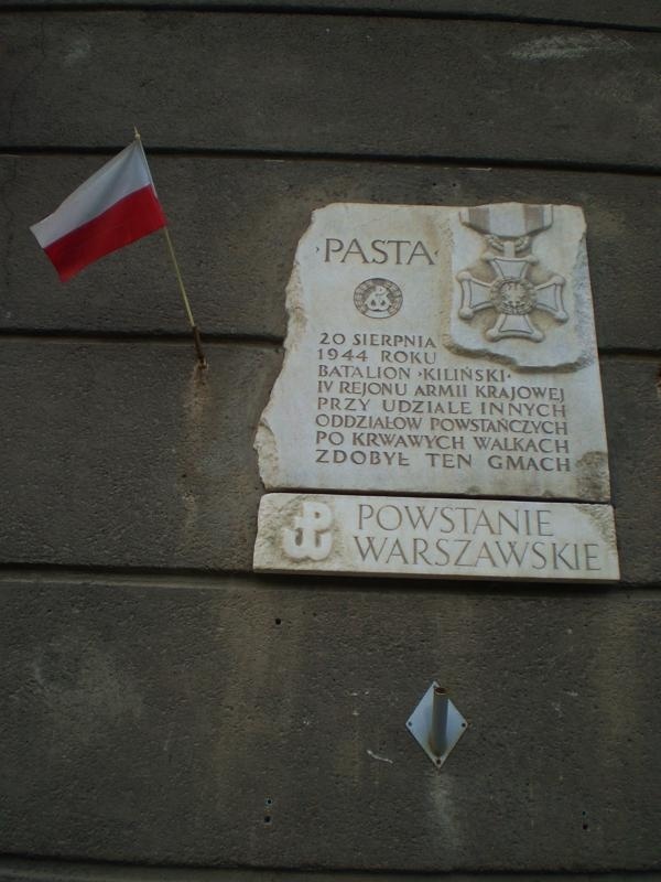 Na frontowej ścianie budynku przy ulicy Zielnej 39 znajduje się tablica z marmuru z napisem: „«Pasta» 20 sierpnia 1944 r. batalion «Kiliński» IV Rejonu Armii Krajowej przy udziale innych oddziałów powstańczych po krwawych walkach zdobył ten gmach”. Uroczyste odsłonięcie nastąpiło 1 sierpnia 1978 r.