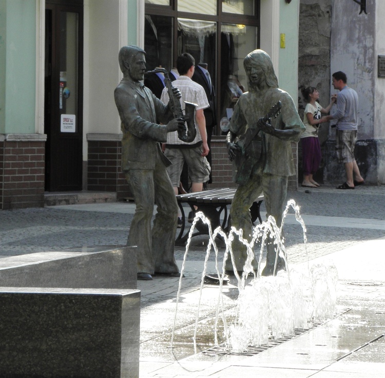 Muzycy przyglądają się kilkunastu strzelającym w niebo strumyczkom wody. Robią to oczywiście w wolnych chwilach… tylko wtedy, gdy nie pozują do pamiątkowych fotografii. Całość sprawia bardzo sympatyczne wrażenie.