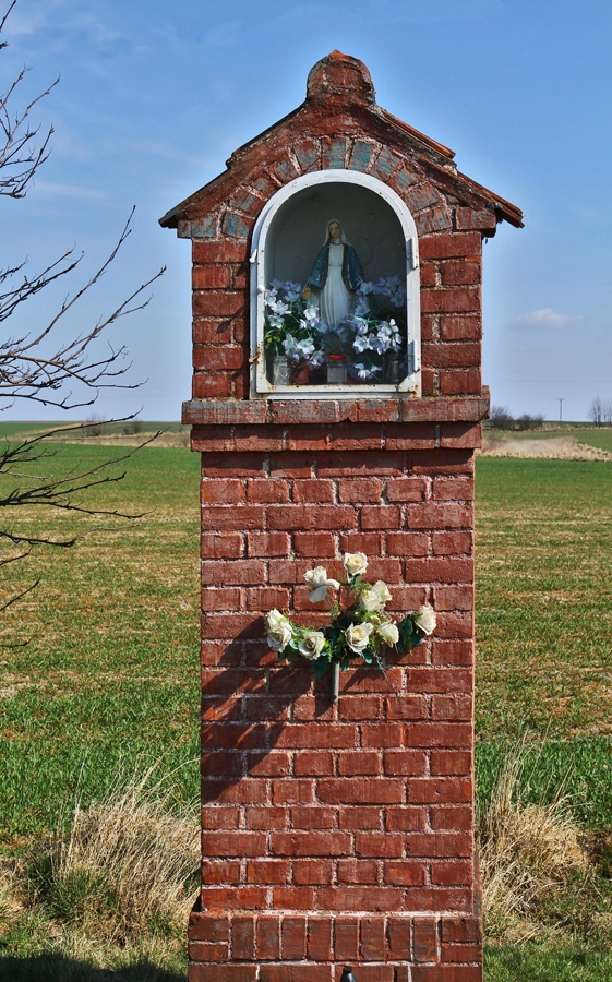 Pomiędzy miejscowością Lubiąż a Gliniany przy asfaltowej drodze stoi murowana przydrożna kapliczka. Niewielka budowla kultowa zbudowana została z czerwonej cegły. Słupowa kapliczka posiada małe okienko w którym stoi figurka Matki Boskiej.