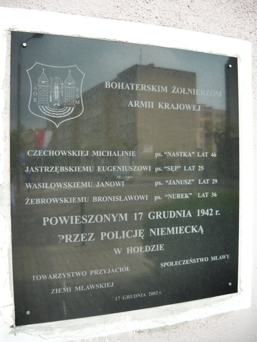 Tablica umieszczona jest na ścianie bloku na rogu ulic Stary Rynek i Chrobrego. Poświęcona została pamięci Bohaterskich Żołnierzy Armii Krajowej: Michalinie Czechowskiej „Nastce”, Eugeniuszowie Jastrzębskiemu „Sępowi”, Janowi Wasiłowskiemu „Januszowi” i Bronisławowi Żebrowskiemu „Nurkowi”, powieszonym 17 grudnia 1942 roku przez policję niemiecką. Tablicę w hołdzie zamordowanym ufundowało w 2002 roku Towarzystwo Przyjaciół Ziemi Mławskiej i społeczeństwo Mławy.