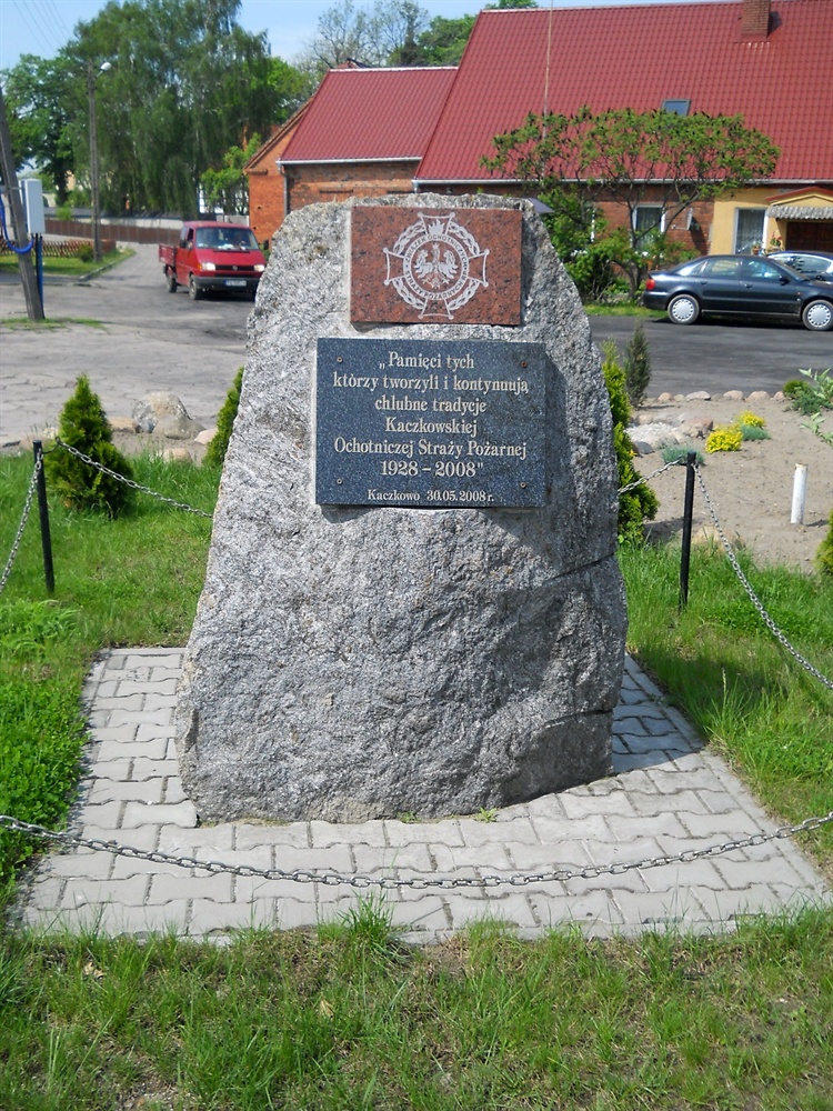 Na olbrzymim kamieniu znajdują się dwie tablice. Górna z nich przedstawia godło Związku Ochotniczych Straży Pożarnych RP. Na dolnej znajduje się napis następującej treści: "Pamięci tych, którzy tworzyli i kontynuują chlubne tradycje Kaczkowskiej Ochotniczej Straży Pożarnej 1928-2008, Kaczkowo - 30.05.2008 r."