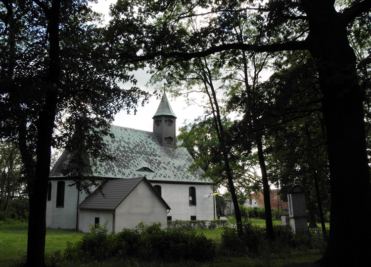 W niewielkiej odległości od kompleksu zamkowego, w otoczeniu drzew, stoi nieduży kościółek z małą sygnaturką na spadzistym dachu. Może nie widać tego na pierwszy rzut oka, ale jest to świątynia szachulcowa. Zbudowano ją na początku XVII w. z fundacji Georga von Schönaicha. Powstała na planie prostokąta.
