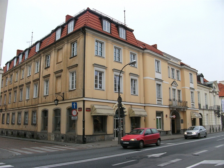 Dwupiętrowa, barokowa kamienica posiadała trzyosiową fasadę z wejściem od strony ulicy Miodowej oraz długą dziesięcioosiową fasadę od strony ulicy Kapitulnej. W trakcie przebudowy w połowie XVIII w. nakryto ją mansardowym dachem z facjatkami. W 1770 r. nabył ją wraz z sąsiednimi budynkami biskup inflandzki Antoni Ostrowski. Z jego inicjatywy Szymon Zug lub Efraim Schröger dokonali ich połączenia. Od tego czasu wnętrza stanowią jedność, choć fasady zachowały odrębność.