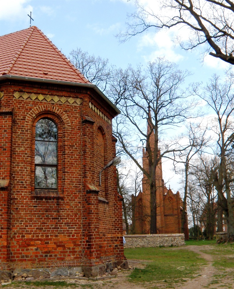 Bardzo blisko katolickiej świątyni pod wezwaniem Świętej Anny wznosi się okazały, wybudowany w XIX w. zbór ewangelicki. Otaczają go wysokie drzewa i ogrodzenie z siatki. Dawno już nie pełni funkcji sakralnych. Jest zamknięty na głucho. W miesiącach letnich drzewa skutecznie odwracają od niego uwagę - nawet strzelista wieża zdaje się z nimi zlewać.