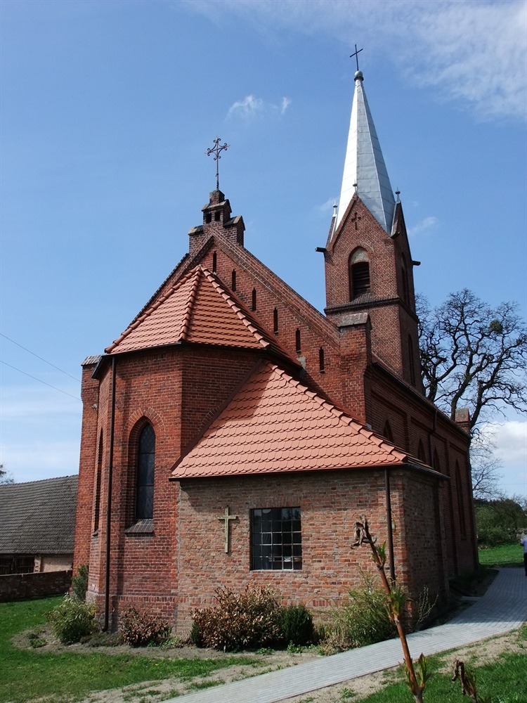 Jest to budowla jednonawowa na planie prostokąta, z absydą i wysmukłą, wysoką wieżą od strony zachodniej. Całość wybudowana z czerwonej cegły w stylu neogotyckim.