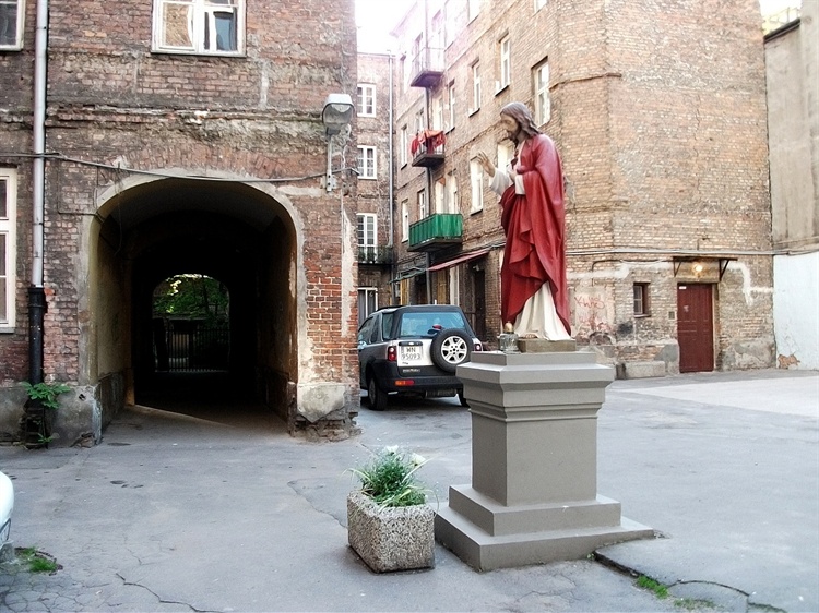 Jedną z nich jest figura Chrystusa na podwórku bardzo zaniedbanej przedwojennej kamienicy przy ulicy Emilii Plater 13. Dziś ładnie odnowiona figura kontrastuje z nietynkowanymi, ceglanymi, wysokimi murami kamienicy. Zwiedzając Śródmieście Południowe, warto tutaj wstąpić, aby poczuć klimat okupacji i wyobrazić sobie izolację mieszkańców miasta w czasie godziny policyjnej.