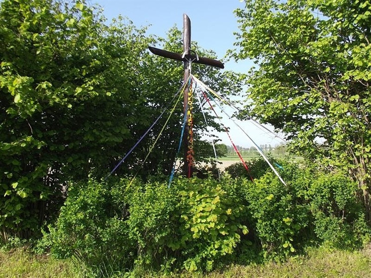 Ten drewniany krzyż przydrożny mieści się we wsi Leśniewo, w gminie Karniewo. Jest on zbity z dwóch drewnianych bali. Jego ogrodzenie stanowi okalający go z czterech stron żywopłot, wewnątrz którego na skromnym ziemnym placyku ustawiono cztery ławki. U swej podstawy wzmocniony jest dwoma betonowymi słupkami. W jego dolnej części zawieszony jest mały domek, w środku którego umieszczono obrazek Matki Bożej.