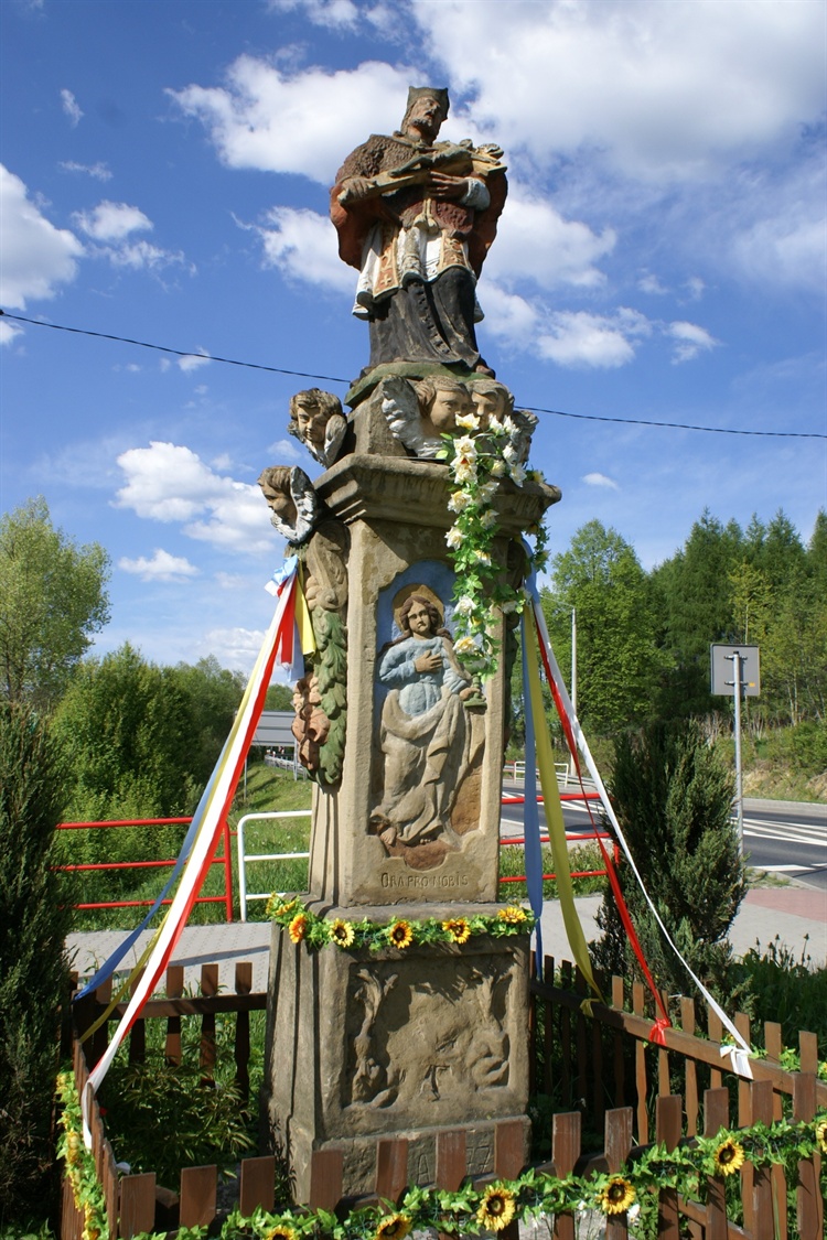 Figura Jana Nepomucena usytuowana jest na rozwidleniu dróg prowadzących do Krakowa i Zubrzycy. Kamienna, polichromowana rzeźba Jana, pochodząca z 1752 roku, znajduje się na postumencie zdobionym główkami amorków. Święty przedstawiony jest w tradycyjnym stroju z krzyżem trzymanym w obu rekach. Cokół, na którym stoi święty, ozdobiony jest między innymi płaskorzeźbami św. Rozalii - z czaszką trzymaną w prawej dłoni i gałązką - oraz Marii Magdaleny z wonnościami.