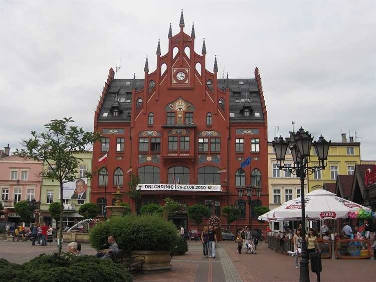 Budynek obecnego ratusza wzniesiony został w 1902 roku, w północnej pierzei rynku. Fasada ratusza jest neogotycka z modernistyczną dekoracją. Trzypiętrowy budynek posadowiono na wysokich suterenach, trzecie piętro znajduje się w szczycie. Dach pokryto dachówką.