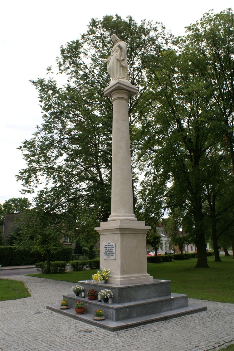8.12.1947 roku została poświęcona figura Matki Boskiej Niepokalanie Poczętej. Ponad dwumetrowa rzeźba wykonana została ze sztucznego granitu i umieszczona na ponad siedmiometrowym cokole w głębi skweru przy stacji paliw. W roku 2011 figurę Matki Boskiej odrestaurowano i ustawiono na nowym postumencie przy zbiegu ulic Pocztowej i Zamkowej. Podczas tych prac odnaleziony został akt erekcyjny, na którym znajdują się między innymi fundatorzy pierwotnej figury. Uroczystość poświęcenia rzeźby na nowym miejscu odbyła się 17.10.2011 roku.