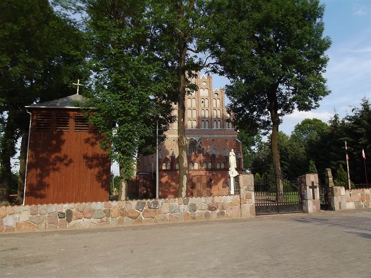 Parafia erygowana została przed 1458 r. staraniem Gołyńskich (Golińskich) herbu Prawdzic. Obecny orientowany kościół murowany wybudowany został w pierwszej połowie XVI, a przebudowany w trzecim ćwierćwieczu XIX w. Jest to świątynia salowa (tzn. jednonawowa), postawiona na planie prostokąta. Po przebudowach uzyskała charakter gotycki z neogotyckimi przekształceniami. Kościół wymurowany jest z czerwonej cegły z użyciem kamieni polnych w podmurówce oraz zendrówki do dekoracji rombowej na elewacjach. Z zewnątrz elewacje oraz naroża opięte są dwuuskokowymi szkarpami. Okna o tynkowanych ościeżach zamknięte są ostrołukowo . Szczyty - wschodni i zachodni - są analogiczne, schodkowe, rozczłonkowane kątowymi filarkami przechodzącymi w sterczyny. Wnętrze ukształtowano podczas przebudowy w XIX w. w stylu gotyku angielskiego. Przed 1935 r. dokonano kolejnych jego zmian: przesklepiono prezbiterium, ukształtowano filary, wystawiono pseudoempirowy ołtarz główny.