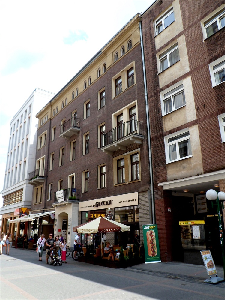 Pierwotne zdobienia budynku skuto prawdopodobnie w dwudziestoleciu międzywojennym. Po zniszczeniach wojennych kamienicę odbudowano, a w latach 60. fasadę wyłożono płytkami ceramicznymi.