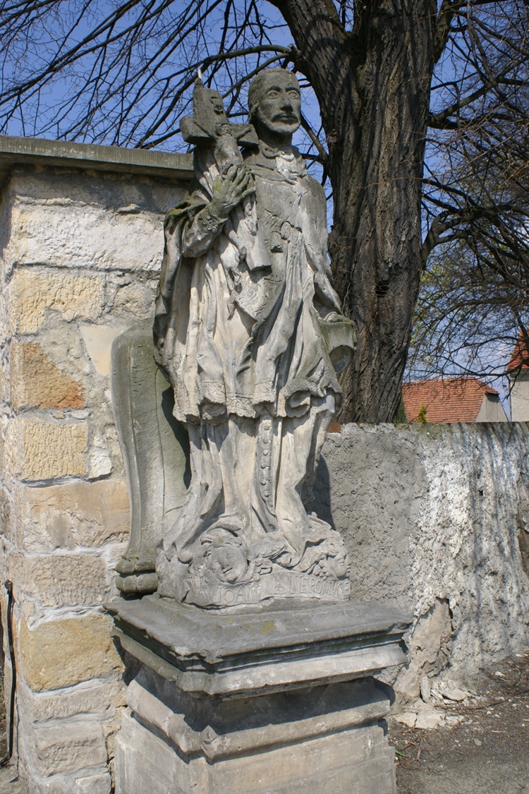 Po prawej stronie bramy wejściowej na teren kościoła św. Jadwigi, na niewysokim postumencie mieści się kamienna rzeźba św. Jana. Barokowa figura stoi na główkach aniołków, pod którymi widnieje napis: "Joannes Nepomucen". Święty przedstawiony jest z odkrytą głową, w prawej dłoni trzyma krzyż, a w lewej biret. Ładnie prezentuje się pofałdowany strój świętego z sutanną opadającą na cokół.