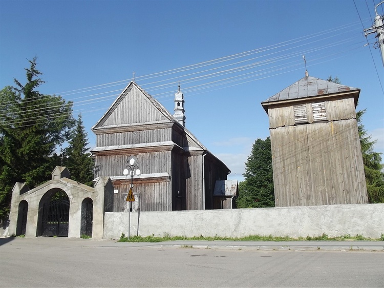 Obecny kościół zbudowano w latach 1772-1774 – jako trzeci z kolei. W XIX wieku był wielokrotnie remontowany. W 1951 roku zmieniono pokrycie dachowe na blachodachówkę. Jest orientowany, drewniany, konstrukcji zrębowej, wzmocnionej lisicami, oszalowany. Nawa jest prostokątna, prezbiterium węższe, wydłużone, zamknięte ścianą prostą, zaś po obu jego stronach mieszczą się prostokątne zakrystia i skarbczyk. Wnętrze rozdzielone jest na nawy trzema parami drewnianych filarów z cokołami i głowicami połączonych odcinkowymi arkadami. Na belce tęczowej umieszczony jest krucyfiks barokowy z XVIII wieku. Chór muzyczny posiada balustradę o iluzjonistycznie malowanych tralkach. W drzwiach do zakrystii i skarbczyka zamontowane są stare zamki. Okna są prostokątne, zamknięte odcinkowo. Dach natomiast jest dwuspadowy o jednej kalenicy, kryty blachą. Czworoboczna wieżyczka na sygnaturkę jest neobarokowa. Ołtarz główny z kolei jest późnobarokowy, pochodzący z ok. 1777 roku, w późniejszym czasie uzupełniany. W jego polu głównym znajduje się obraz Matki Boskiej z ok. połowy XVIII, przemalowany w wieku XIX, w sukience drewnianej barokowo-ludowej. Przy obrazie mieszczą się tabliczki wotywne z blachy srebrnej. Są tu ponadto dwa ołtarze boczne – analogiczne, późnobarokowe z 1777 roku. Ambona również jest późnobarokowa, prosta w swej budowie, zbudowana w 1778 roku kosztem proboszcza i parafian. Chrzcielnica jest rokokowa z 1778 roku w formie muszli, ustawiona na tle boazerii z tego samego czasu na ścianie z nowym malowidłem Chrztu Chrystusa. Kropielnica jest gotycka, granitowa z XV/XVI wieku (na zewnątrz świątyni, od strony południowej). Są tu też dwa konfesjonały oraz ławki barokowe z XVIII wieku. Feretron jest późnobarokowy z drugiej połowy XVIII wieku z obrazem św. Józefa z Dzieciątkiem Jezus. Balustrada przed ołtarzem głównym jest tralkowa z XVIII wieku.