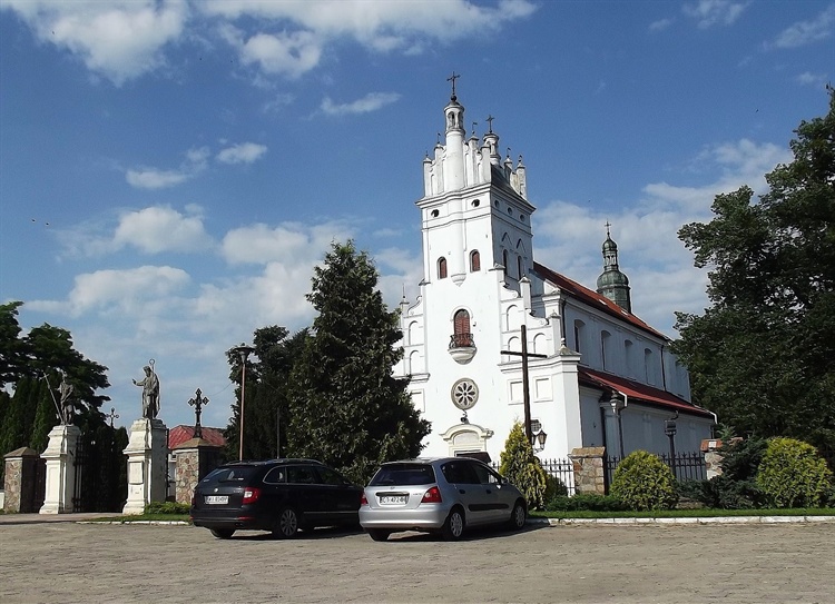 Obecny późnogotycki, murowany (niewątpliwie pierwotnie jednonawowy) kościół z wieżą wtopioną w korpus wzniesiony został w latach 1570-75 z fundacji Franciszka Krasińskiego – podkanclerzego wielkiego koronnego, prepozyta płockiego, biskupa krakowskiego. Zapewne w pierwszej połowie XVII w. przekształcono fasadę w stylu późnorenesansowym. W drugiej połowie XVII w. – jak mówią kroniki – powiększony został o tzw. „trzeci chór” (być może obecne prezbiterium) i ponownie konsekrowany w 1684 r. W latach 1682-1879 kościół obsługiwany był przez kanoników regularnych z Czerwińska.