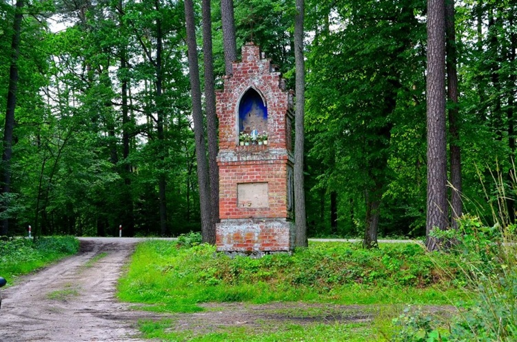 Kapliczka jest budowlą XIX wieczną, stylem nie odbiega od innych tego typu neogotyckich budowli. Wysoka, dwukondygnacyjna, murowana z czerwonej cegły, dach dwuspadowy, schodkow,y zwieńczony metalowym krzyżem. Dwie nisze z czoła, dolna płytka, górna głęboka pokryta niebieską polichromią, dwie nisze boczne. Do naszych czasów nie zachowało się oryginalne wyposażenie. Ktoś współcześnie umieścił w górnej niszy niewielką figurę Matki Boskiej.