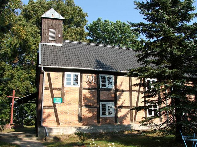 Kościół konstrukcji szkieletowej wypełnionej murem ceglanym, posadowiono na niskiej podmurówce z kamieni polnych. Jest salowy, wzniesiony na planie wydłużonego prostokąta, z niewydzielonym prezbiterium, za którym na całą szerokość korpusu znajduje się, wydzielona, zakrystia. Dach kościoła dwuspadowy pokryty jest holenderką. Nad szczytem zachodnim umieszczono kwadratową wieżyczkę.