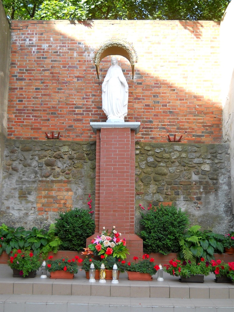 Figura Matki Boskiej znajduje się na dziedzińcu kościoła pw. Matki Boskiej Częstochowskiej. Jest to biały posąg umiejscowiony na wysokim cokole z murowanej cegły. Wkomponowana jest w znakomity sposób w pozostałości murów obronnych z XIV wieku.