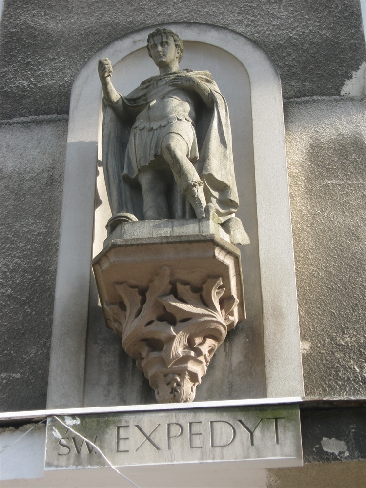 Rzeźba przedstawia Św. Ekspedyta - rzymskiego legionistę w zbroi i płaszczu, który trzyma w dłoniach krzyż i palmę, a nogą depcze kruka. W 303 r. poniósł męczeńską śmierć. Jest on patronem żeglarzy, handlowców, studentów i egzaminatorów, opiekunem spraw pilnych.