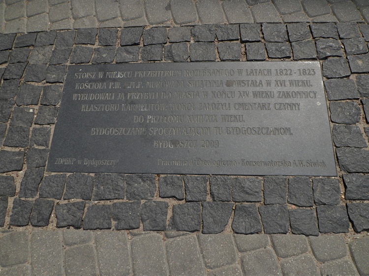 Po bydgoskiej siedzibie karmelitów pozostały elementy wyposażenia rozrzucone po różnych świątyniach. W miejscu dawnego prezbiterium kościoła karmelickiego, którego zarys zaznaczono granitową kostką, w 2009 r. zamontowano pamiątkową tablicę. Miejsce to znajduje się w pobliżu przejścia dla pieszych u zbiegu ulic Mostowej i Marszałka Ferdynanda Focha.