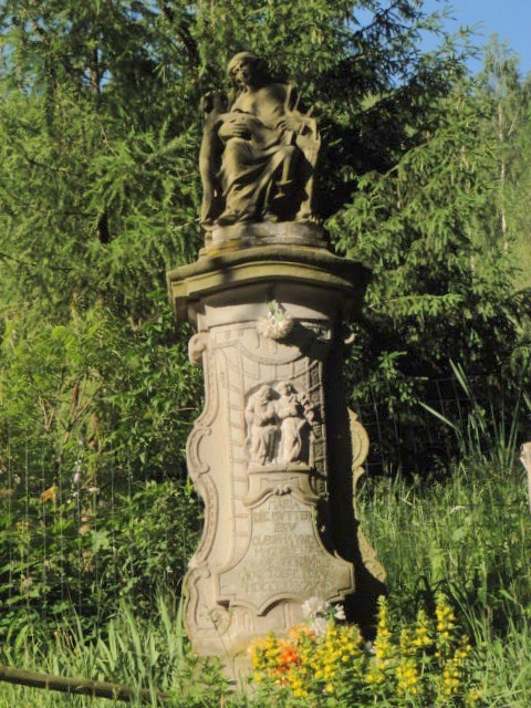 Barokowa Pieta z 1780 roku na cokole z inskrypcją, stojąca przy drodze do Bystrzycy Kłodzkiej.