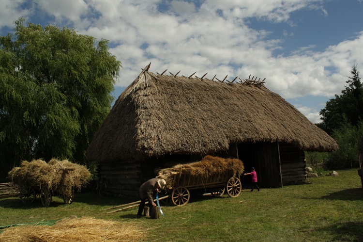 Na razie stoją tam dwa kryte strzechą budynki gospodarskie (szczególnie urokliwy jest świronek), drewniane ule, drabiniasty wóz wypełniony słomą. Są swojskie jarzębiny, dawne narzędzia i płot z wierzbowych witek. Przy wejściu na przydworkowy teren wita nas drewniana tablica, na której przedstawiono mapę. Pod daszkiem wyraźnie widoczny napis: „Ziemia, skąd nasz ród” . Nie da się ukryć, że potomkom Zabużan łezka w oku kręci się już tutaj. Polecam jednakże odwiedzenie izby muzealnej. Zgromadzone w niej eksponaty przyjechały w bagażach przesiedleńców. Niektóre stroje i święte obrazki mają ponad 100 lat. Jest oryginalna poleska kołyska i… plecione z łyka łapcie. Są książki, fotografie, dokumenty.