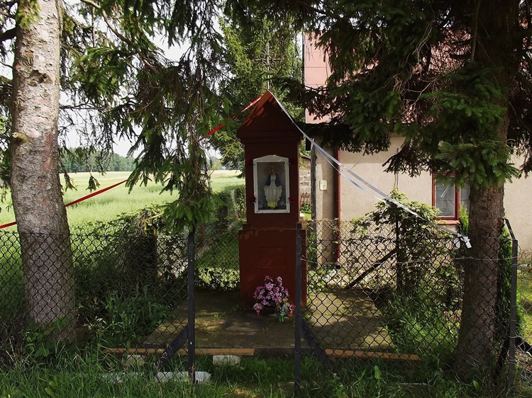 Znajduje się - jadąc od strony Makowa Mazowieckiego - prawie na samym końcu wsi. Jest to dwustopniowa, zadaszona kapliczka słupkowa zwieńczona żelaznym krzyżem. W najniższej jej części zachowała się płyciutka nisza, w której niestety nie ma już ani tabliczki, ani żadnego wyrytego (prawdopodobnie) napisu. W górnej części, za oszklonymi drzwiczkami umiejscowiono figurkę Matki Boskiej. Kapliczka ustawiona jest na wybetonowanym podłożu i otoczona jest siatką.