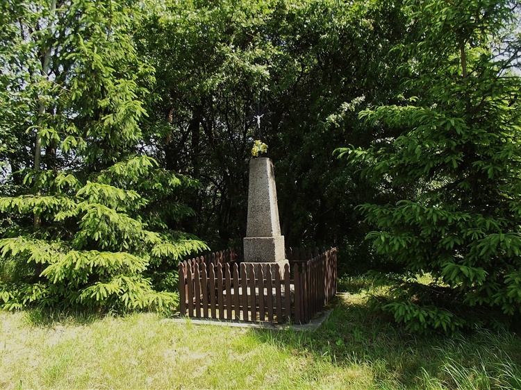 Znajduje się w jednej z dawnych wsi folwarcznych rodziny Chełchowskich. Czterostopniowy postument wykonano z kamienia i zwieńczono żelaznym krzyżem. Na cokole wyryta jest data 1938 r.