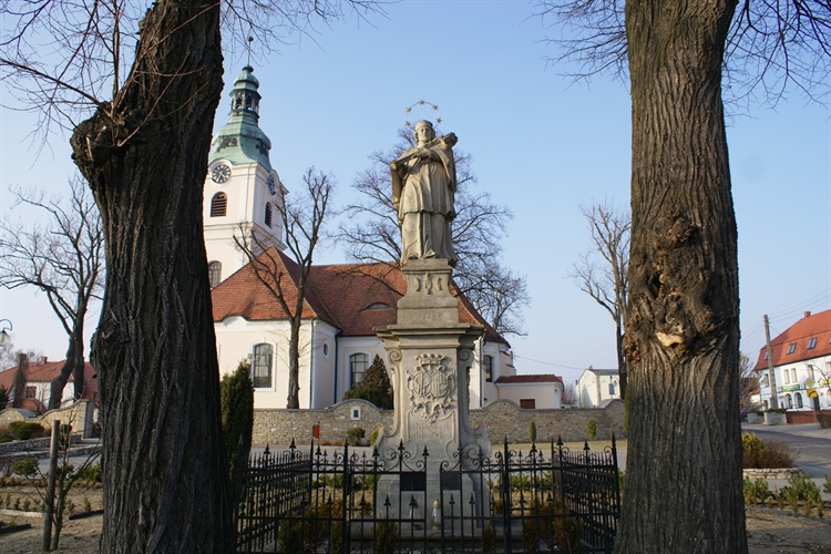 Przed kościołem pw. św. Jacka na ładnym zdobionym cokole z kartuszem herbowym stoi kamienna barokowa rzeźba św. Jana Nepomucena. Rzeźba została ufundowana w 1784 r. przez rodzinę Larischów. Św. Jan trzyma krzyż oparty na lewym ramieniu. Głowa świętego przkryta jest biretem nad którą umieszczona została pięciogwiezdna aureola. Rzeźba znajduje się za niewielkim, ozdobnym metalowym ogrodzeniem. Druga, prymitywna niewielka figurka świętego znajduje się w niewielkiej ceglanej kapliczce którą wieńczy niewielki metalowy krzyż.