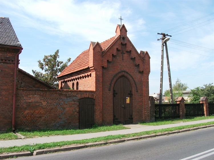 Neogotycka kaplica, będąca kostnicą, zbudowana została około 1890 r. Wzniesiono ją z czerwonej cegły, a jej dwuspadowy dach pokryty został dachówkami. Fasada z bramą ozdobiona została sterczynami, z których szczytową zwieńczył metalowy krzyż.