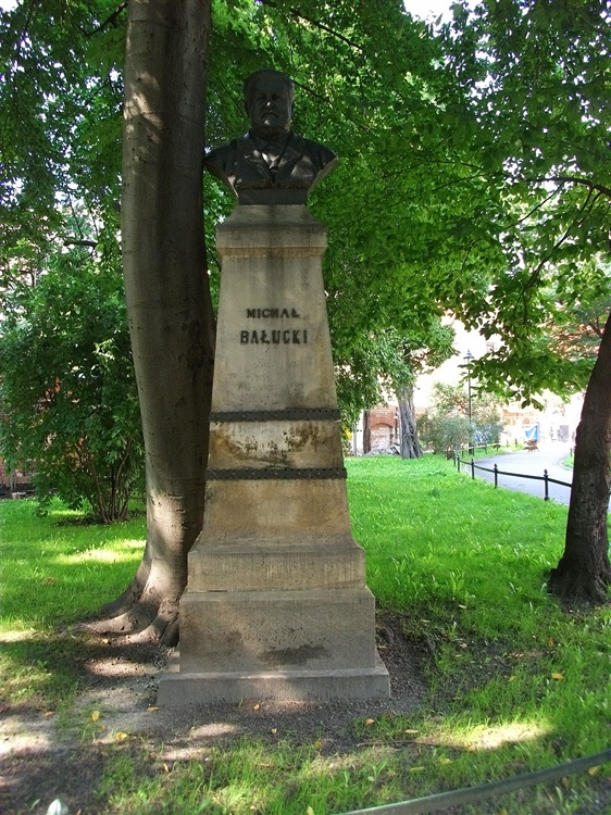Michał Bałucki (1837-1901) pisarz powieściowy i komediowy żyjący w Krakowie. Skonfliktowany z twórcami Młodej Polski i cierpiący na nerwicę popełnił samobójstwo na Błoniach. W 1914 r. na Plantach w pobliżu Teatru Słowackiego stanął jego pomnik będący dziełem Tadeusza Błotnickiego. Najbardziej znanym utworem pisarza był wiersz "Dla chleba" czyli sławne "Góralu czy ci nie żal".