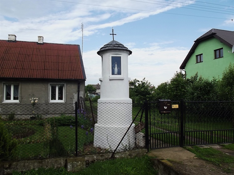 Znajduje się przy głównej ulicy Krasnego, w pobliżu Urzędu Gminy. Wzniesiona została w pierwszej połowie XIX wieku. Murowana z cegły, otynkowana, słupowa, cylindryczna na uskokowo zwężającym się ku górze, trójstopniowym cokole. W górnej części cztery wnęki. Jedna z nich – od wschodu – przeszklona, z figurką Matki Boskiej. Całość zwieńczona okrągłym daszkiem pokrytym dachówką i żelaznym krzyżem z malutką chorągiewką.