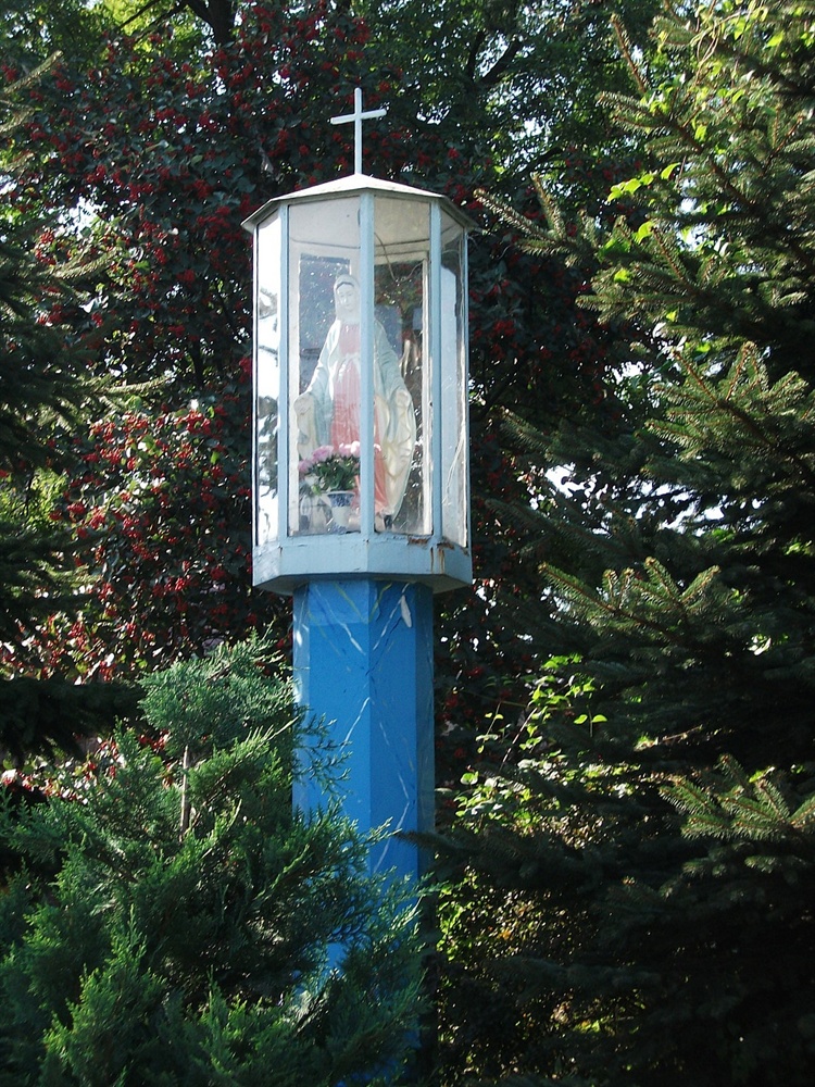Stojąca wśród iglaków reprezentuje formę słupowo-skrzynkową. Na smukłym słupie umieszczono ośmiokątną, oszkloną ze wszystkich stron skrzynkę, w której stoi figura Matki Boskiej. Podświetlaną skrzynkę wieńczy niski, również ośmiokątny daszek z krzyżem. Całość pomalowana jest charakterystycznymi dla Matki Boskiej biało-niebieskimi barwami.