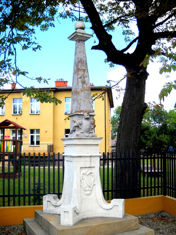 W pobliżu kościoła pw. NMP Szkaplerzowej, na zamkowym wzgórzu, gdzie kiedyś był zamek Lubomirskich, znajduje się interesujący pomnik. Jak mówią dawne przekazy, obelisk stoi w miejscu pojedynku dwóch braci Lubomirskich w którym jeden z nich zginął.Obelisk podzielony jest na dwie części: dolna opatrzona herbem Szreniawa, pochodząca z XVIII wieku i górna wykonana z chęcińskiego marmuru z płaskorzeźbą przedstawiającą dwa lwy i kartusz z herbami Półkozic, Trąby, Leliwa i Nieczuja oraz Sulima. Obelisk zwieńczony jest krzyżem maltańskim jako że ten który zginął był członkiem tego właśnie zakonu.