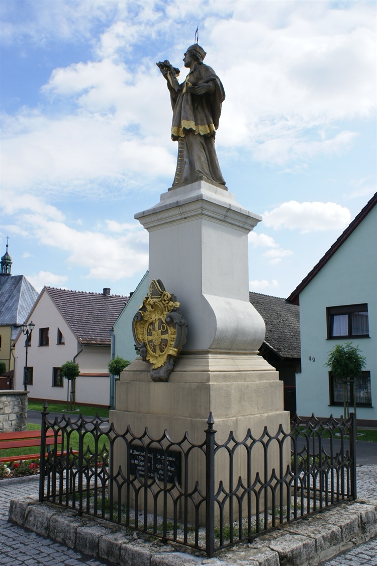W centrum miejscowości Jemielnica na wysokim cokole ogrodzonym niskim, metalowym płotkiem znajduje się kamienna, barokowa, polichromowana figura św. Jana Nepomucena z 1756 r. Święty przedstawiony jest w stroju kapłańskim z aureolą nad głową. W prawej ręce trzyma krzyż ułożony na gałązce złotej palmy, natomiast w lewej rzadko spotykany przy figurach atrybut, czyli księgę - znak uczonego i teologa. Na uwagę zasługuje również tarcza herbowa opactwa cystersów z orłem na tle krzyża i inicjałami "EG MORS". Fundatorem figury był opat z pobliskiego klasztoru Eugen Misura.