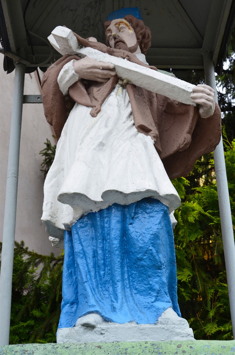 Tym razem nieco krócej. Przemierzając ulice Żarek, kierując się w stronę kościółka św. Barbary, całkiem przypadkowo natknąłem się na ciekawą figurę przedstawiającą postać św. Jana Nepomucena. Niestety, nie udało mi się dotrzeć do informacji dotyczących daty jej powstania. Sama figura wygląda na odnowioną. Umieszczona jest na ceglanym cokole i zadaszona (ups!) szkaradnym, kompletnie psującym estetykę daszkiem. Poza tym raczej nie jest wdzięcznym obiektem do fotografowania.