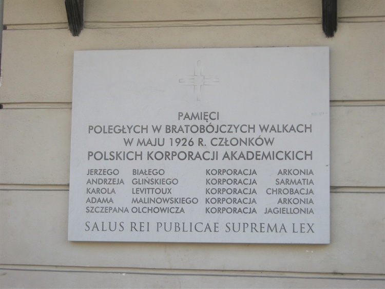 Tablica pamięci poległych w bratobójczych walkach członków Polskich Korporacji Akademickich znajduje się na elewacji kamienicy Johna przy Krakowskim Przedmieściu 89 od strony Placu Zamkowego. Upamiętnia ona poległych podczas przewrotu majowego w 1926 r. członków Polskich Korporacji Akademickich, którymi byli: Jerzy Białek i Adam Malinowski z korporacji Arkonia, Andrzej Gliński z korporacji Sarmatia, Karol Levittoux z Chrobacji oraz Szczepan Olchowicz z Jagiellonii.