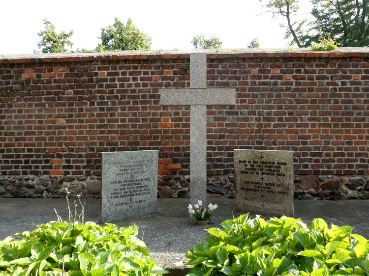 Podczas prac porządkowych 12 sierpnia 1980 r. przy kościele odkryto zbiorową mogiłę usytuowaną przy murze otaczającym teren świątyni. Od tego czasu w miejscu tym stoi pomnik składający się z posadowionego centralnie krzyża oraz dwóch płyt po jego bokach. Na płytach tych widnieje napis: "Tu znajduje się zbiorowy grób ze starego cmentarza wokół kościoła odkryty 12 VIII 1980 r." Treść ta podana jest również w językach niemieckim, angielskim i francuskim.