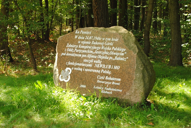 Pomnik wzniesiono w 2006 r. przez leśników z nadl. Kłobuck oraz dawnych żołnierzy z oddziałów Konspiracyjnego Wojska Polskiego "Jastrzębie" i "Oświęcim" , którzy to w 1946 r. niedaleko Bukowej Górki zmierzyli się z oddziałami milicji i NKWD. Należy dodać, iż wspomniani wyżej partyzanci walczyli u boku kpt. Stanisław Sojczyńskiego "Warszyca", który powołał do istnienia KWP, którego to władza ludowa PRL, skutecznie w 1947 r. uśmierciła nie wyjawiając gdzie znajduje się jego pochówek, chcąc tym samym wymazać go z narodowej pamięci, co jak widać się nie udało. Pomnik znajduje się w połowie drogi z Parzymiech do Jaworzna, przy drodze krajowej nr. 42.