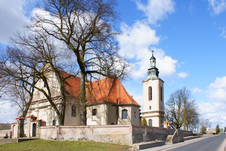Neobarokowy kościół został zbudowany wg projektu arch. Mariana Andrzejewskiego. Można tu jednak odnaleźć wiele elementów z poprzedniego kościoła, m.in. orientowane prezbiterium tworzące przedsionek obecnego, kruchtę z lożami na piętrze i otwartymi do wnętrza arkadami, oraz boczny ołtarz będący do 1936 r. głównym. W nowym ołtarzu natomiast, warto zobaczyć dwie barokowe rzeźby biskupów.