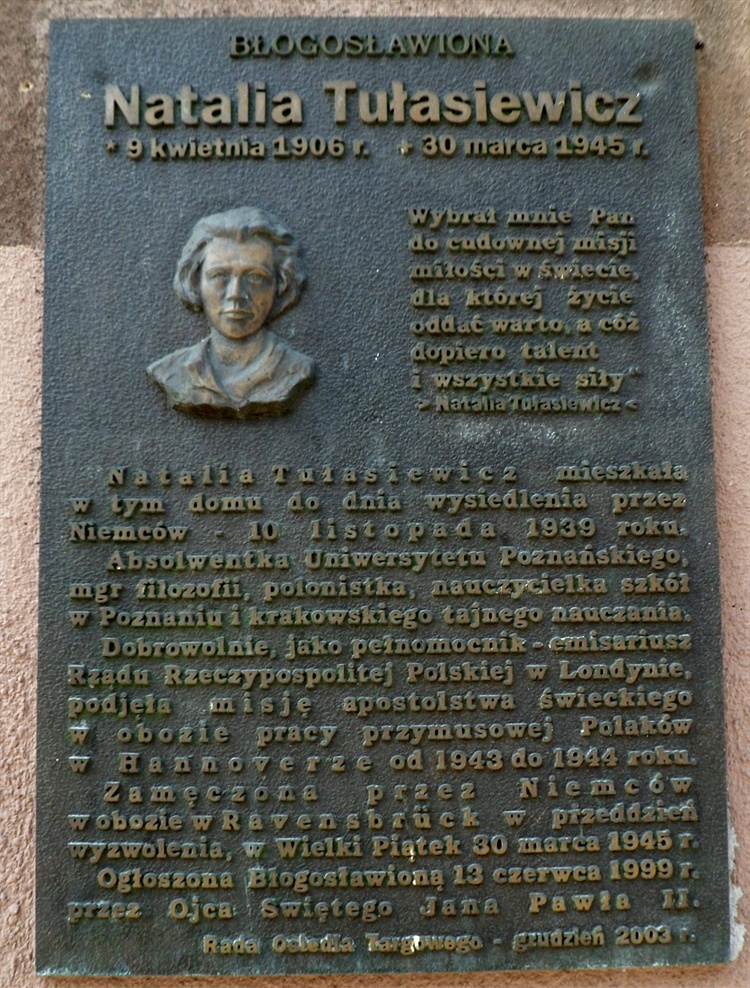 Natalia Tułasiewicz (1906-1945) była przed wojną nauczycielką w poznańskich szkołach, a po wysiedleniu w 1939 r. do Generalnego Gubernatorstwa uczestniczyła w tajnym nauczaniu. Od 1943 r. wspierała polskich robotników przymusowych w Hanowerze. Przebywała tam jako delegat Rządu na Emigracji oraz przedstawiciel konspiracyjnej, katolickiej organizacji Zachód. Ujęta przez hitlerowców, po bestialskich przesłuchaniach skazana została na śmierć. Zamęczono ją w obozie koncentracyjnym Ravensbrück 30 marca 1945 r. niespełna miesiąc przed jego wyzwoleniem.