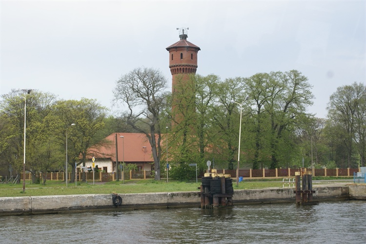 Wieża ciśnień - obiekt miejskiej sieci wodociągowej - wzniesiona została w 1898 r. w pobliżu ujścia Świny nieopodal portu jachtowego. Wieża zbudowana została z czerwonej cegły, czerwonego granitu oraz czerwonego kamienia piaskowego. Pod koniec wojny, w wyniku bombardowań miasta, konstrukcja obiektu została lekko uszkodzona.