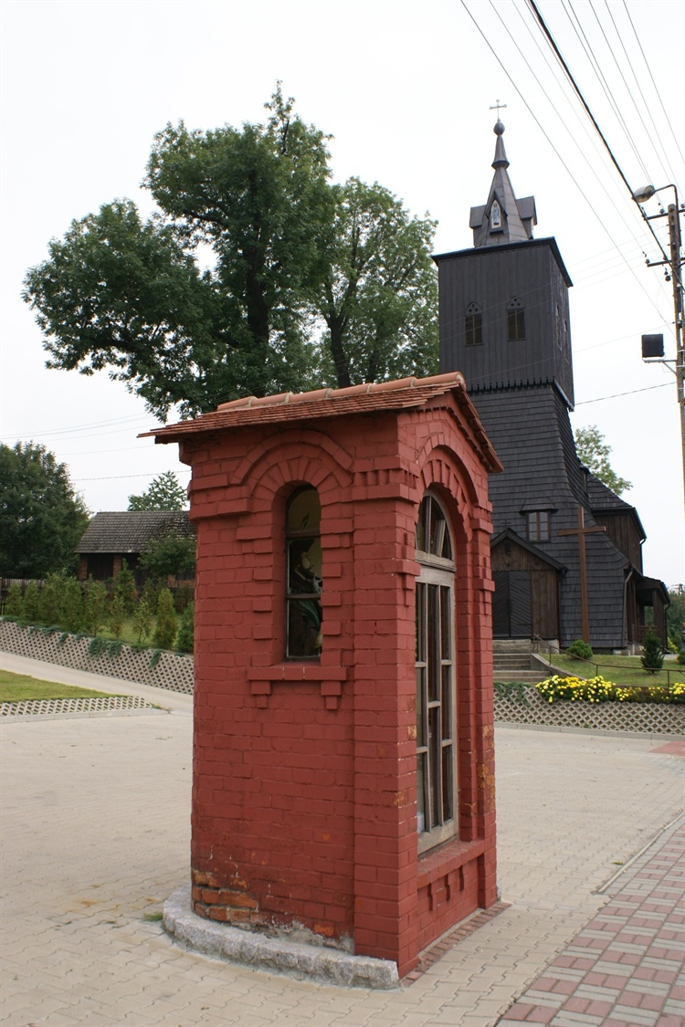 Na skraju parkingu przed drewnianym kościołem św. Anny jest murowana, przeszklona kapliczka przykryta dwuspadowym daszkiem. Wewnątrz kapliczki znajduje się drewniana figura świętego Jana Nepomucena. Święty przedstawiony jest w tradycyjnym stroju kapłańskim z gałązką palmy, krzyżem oraz aureolą nad głową przykrytą biretem.