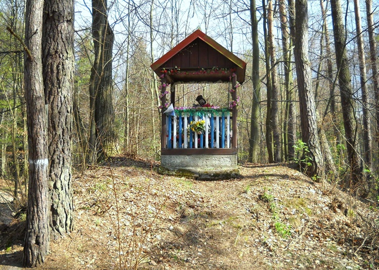 Na południe od Nowego Nartu rozpościera się spory kompleks leśny, w środku którego znajduje się dawny pałacyk myśliwski hrabiów Ressequierów a następnie barona Jana Götz-Okocimskiego. Przy jedynej drodze dojazdowej z Nartu do pałacyku, przy skrzyżowaniu leśnych dróg stoi kapliczka św.Jana Nepomucena. Kapliczkę ustawiono na niewielkim wzniesieniu, ale kiedy i przez kogo nie udało mi się ustalić. Jak mówią ludzie, stoi tam od zawsze. Choć zadaszenie jest odremontowane, to sama drewniana rzeźba nosi wyraźne ślady swego długiego tu istnienia.