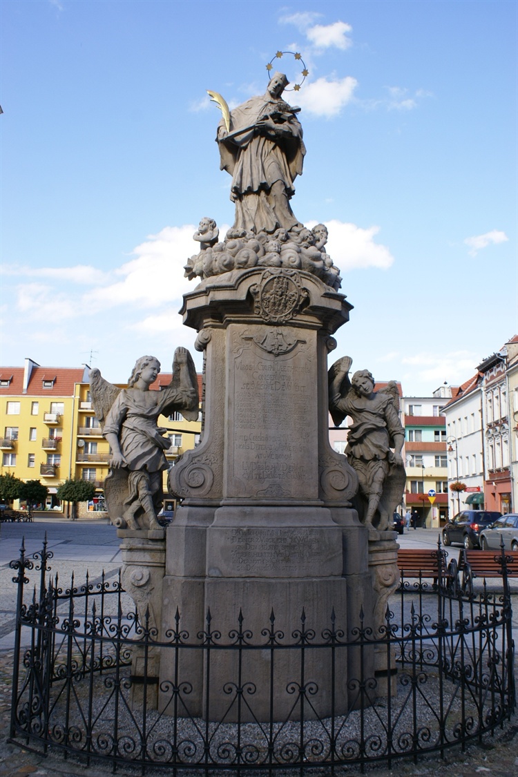 Rzeźba świętego ustawiona jest na przepięknym cokole, na którym znajdują się chronostychy opisujące historię powstania rzeźby. Przystawione w 1746 r. do boków cokołu dwie figury aniołów wykonane z piaskowca znacznie przyczyniły się do upiększenia całego pomnika. Na szczególną uwagę zasługuje chronostych widniejący na centralnej części cokołu. Znajdują się tutaj wymienieni fundatorzy tego obiektu rzeźbiarskiego. Niewątpliwą ciekawostką jest fakt, że wszyscy fundatorzy obiektu - poza burmistrzem - mieli na imię Jan.