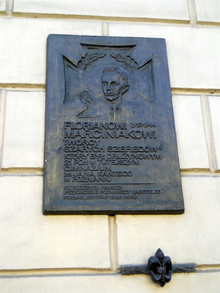 Florian Marciniak był Drużynowym 21 PDH w istniejącym wówczas w tym miejscu gimnazjum. Urodził się 4 maja 1915 roku w Gorzycach koło Czempinia. Maturę zdał w 1934 roku we wspomnianym Gimnazjum im. Jana Kantego. Następnie studiował prawo na Uniwersytecie Poznańskim. Od najmłodszych lat należal do harcerstwa. 10 maja 1938 roku został najmłodszym harcmistrzem w ZHP. W czasie II wojny światowej stworzył i został naczelnikiem Szarych Szeregów. W marcu 1943 roku wziął udział w przygotowaniach do Akcji pod Arsenałem. Aresztowany został 6 maja w Warszawie przez poznańskich funkcjonariuszy Gestapo. Zamordowano go 20 lub 21 lutego w obozie koncentracyjnym w Gross-Rosen.